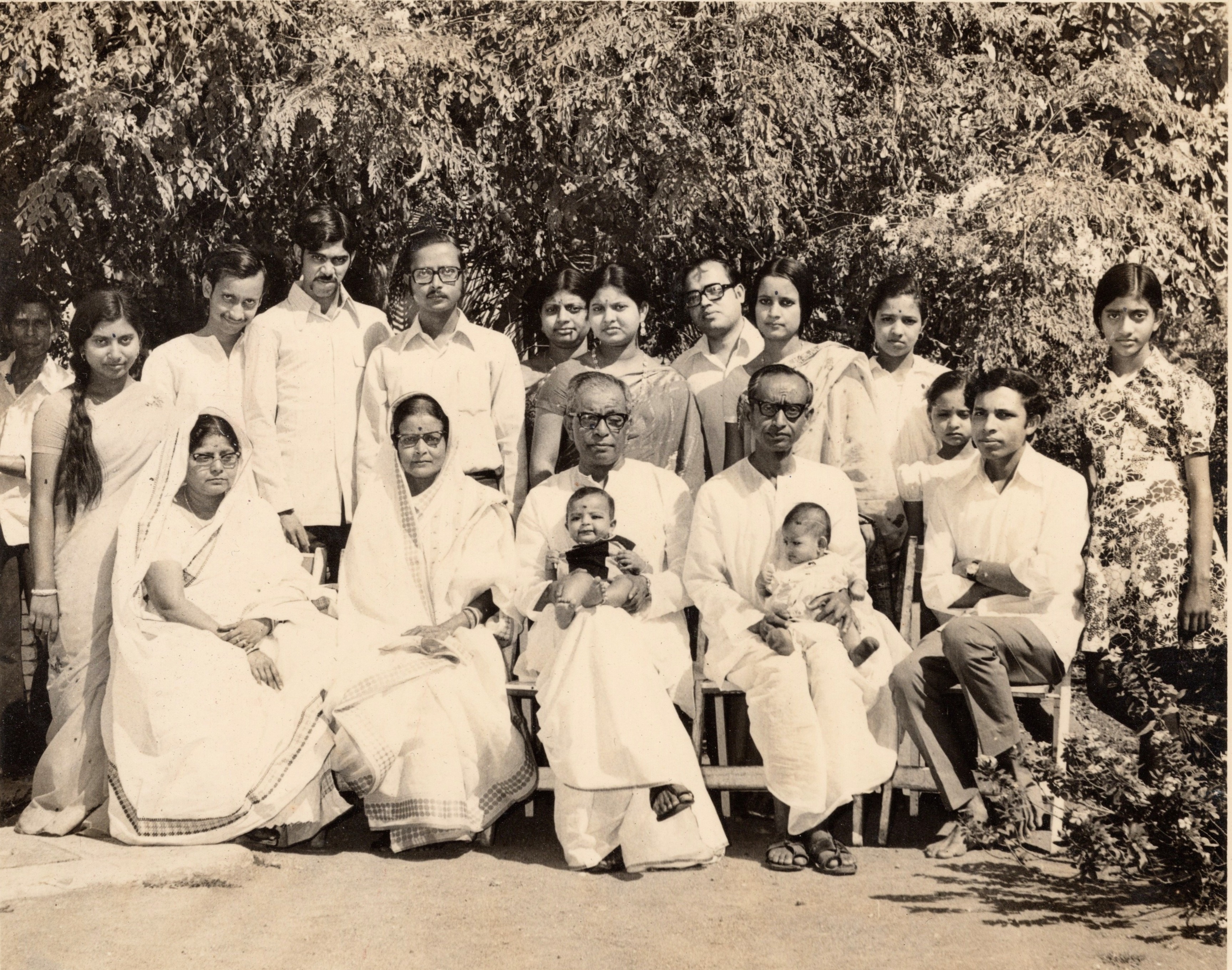 Our grandparents pose with their sons, daughters, nephew, nieces and grand kids in a beautiful group photograph probably in Surat, Gujarat. Surat was the hub of cotton textile production, a city that my maternal grandparents migrated to from Barisal in undivided Bengal. While they carried stories of trauma from losing their homes and lands from the partition of India, their indomitable spirit to build their lives from scratch led them to a promising land of divided yet secular India.
